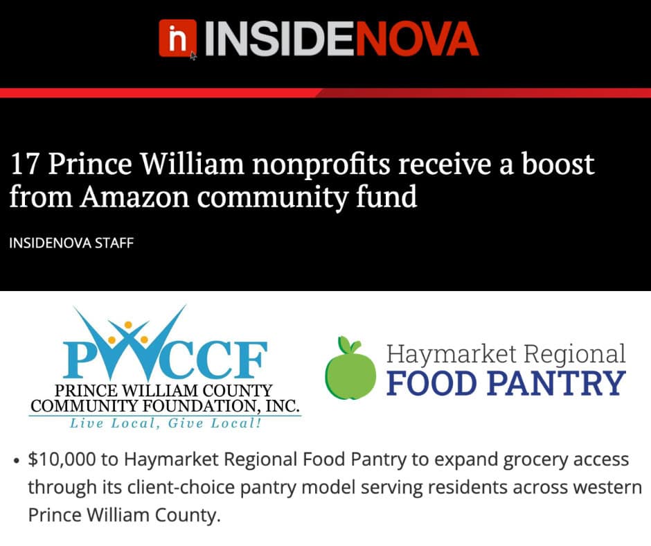 Recently, the Haymarket Regional Food Pantry was selected as one of several local nonprofits to receive funding through the Amazon Prince William County Community Fund, a partnership between Amazon and the Prince William County Community Foundation that supports projects across five key focus areas: health and wellness, food security, sustainability and environment; veterans and military…